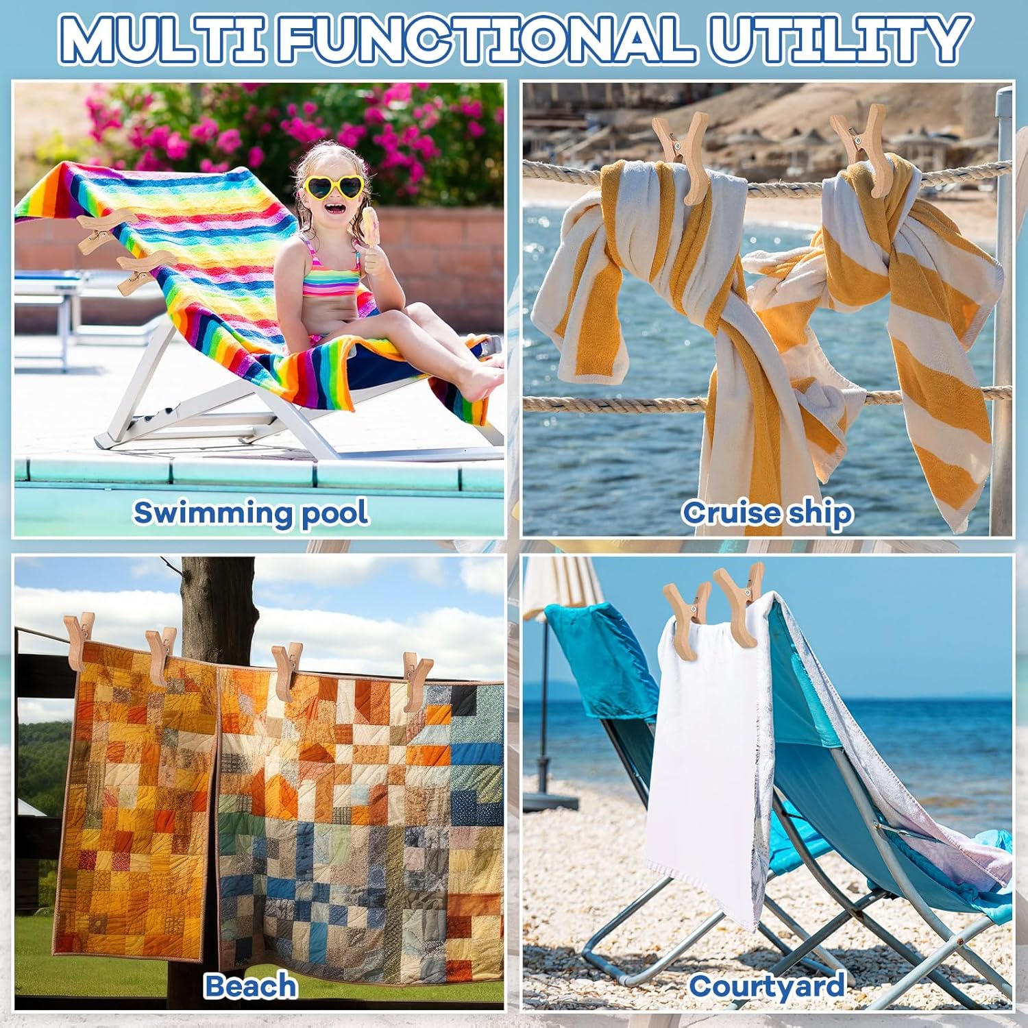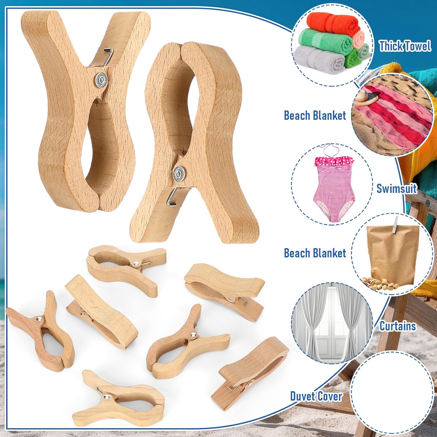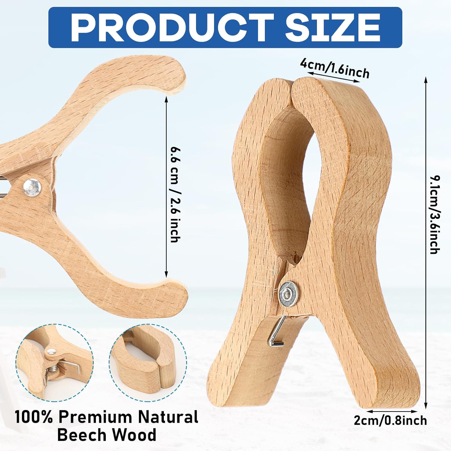 Features: Our towel clips for chairs cruise are incredibly easy to use, requiring minimal effort to secure a variety of items. Ideal for coastal vacations or everyday household uses, they are a reliable tool that enhances convenience in numerous scenarios. Made from sustainable materials, these beech wood towel clips are not only functional but also an environmentally conscious choice. Enjoy the peace of mind that comes with using a product that is as sustainable as it is effective. Specifications: Material: beech wood Color: wood color Size: about 3.58 x 1.75 inch (L x W) Package includes: 12 x Beach towel clips Notes: Manual measurement, please allow slight errors on size. The color may exist a slight difference due to different screen displays